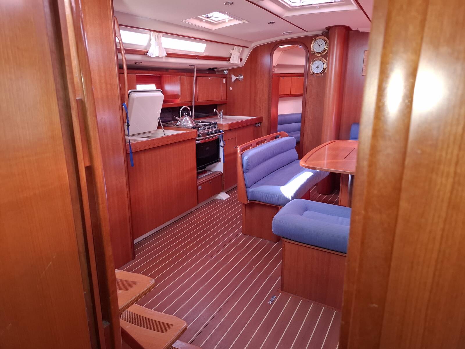Mediterranean blue upholstery on the table surround seating in the main saloon.