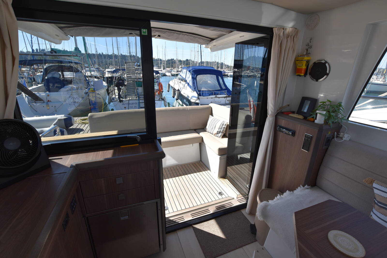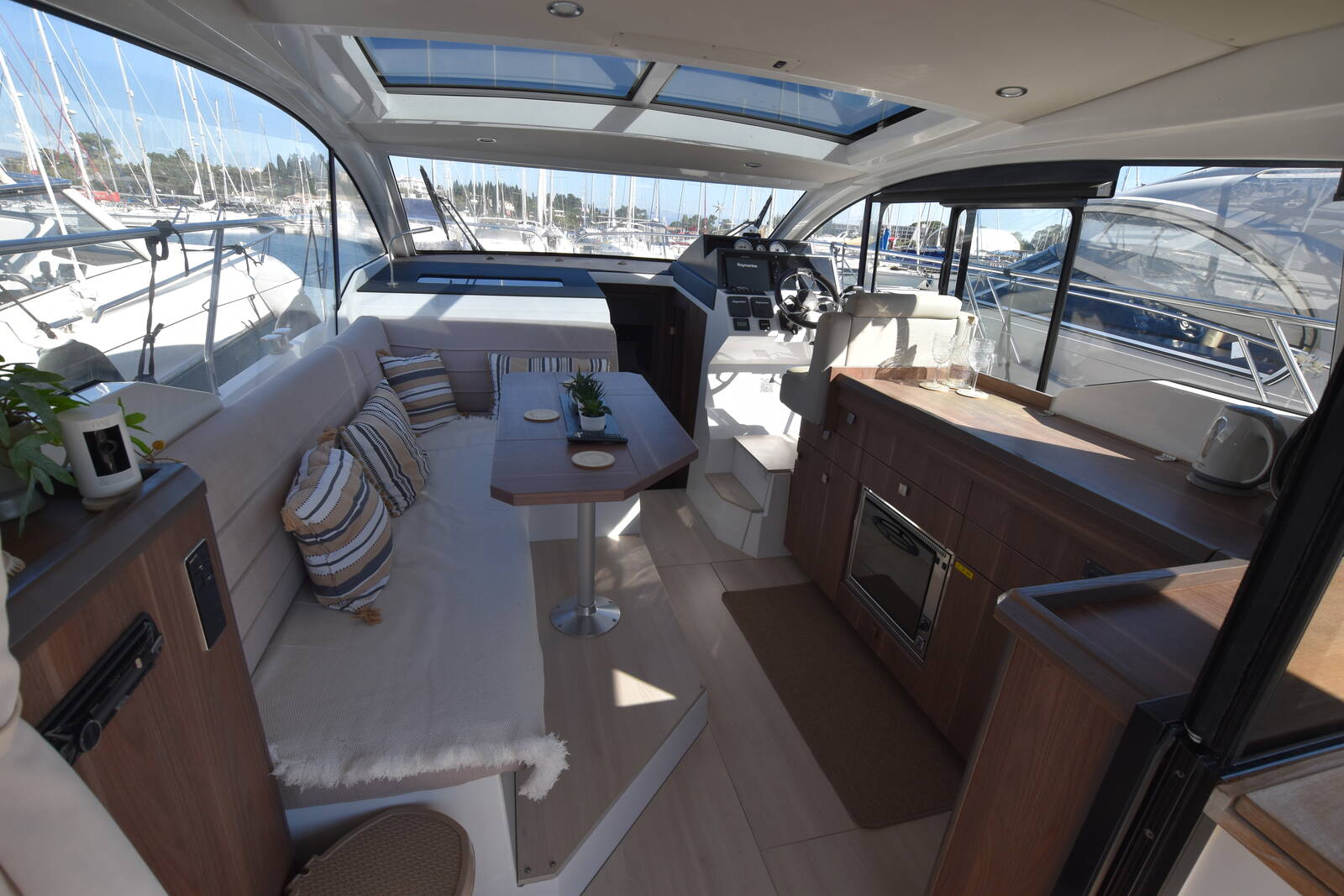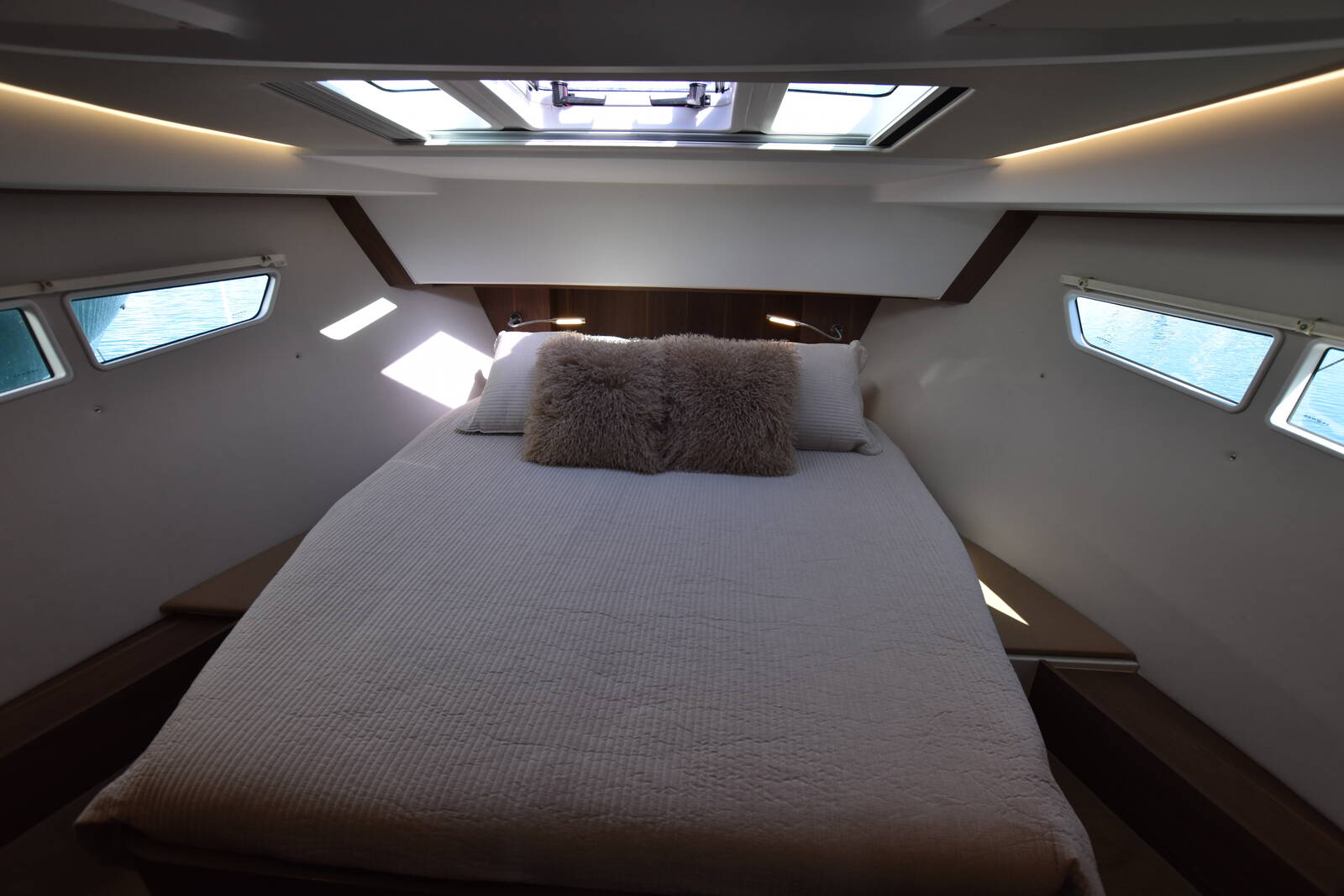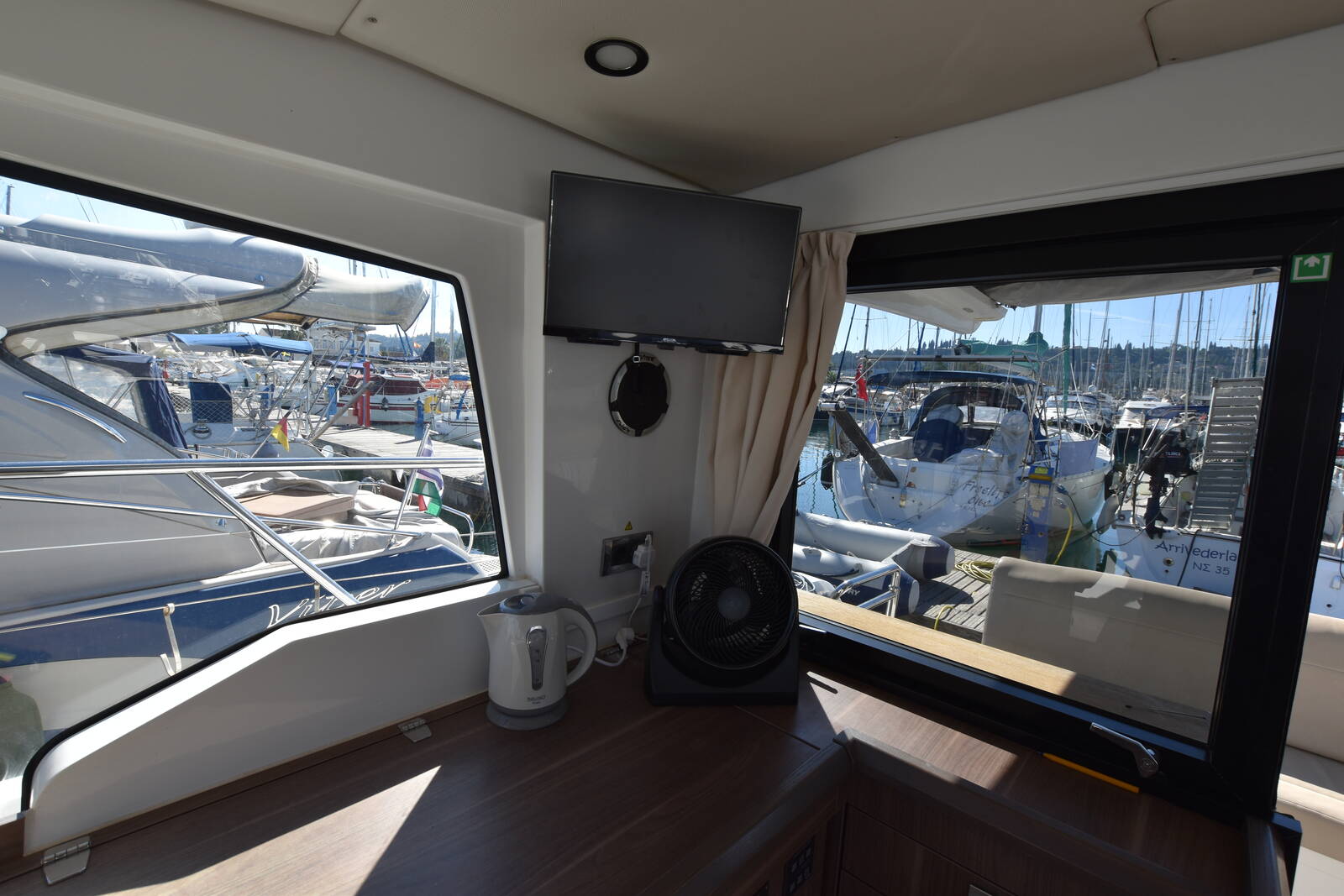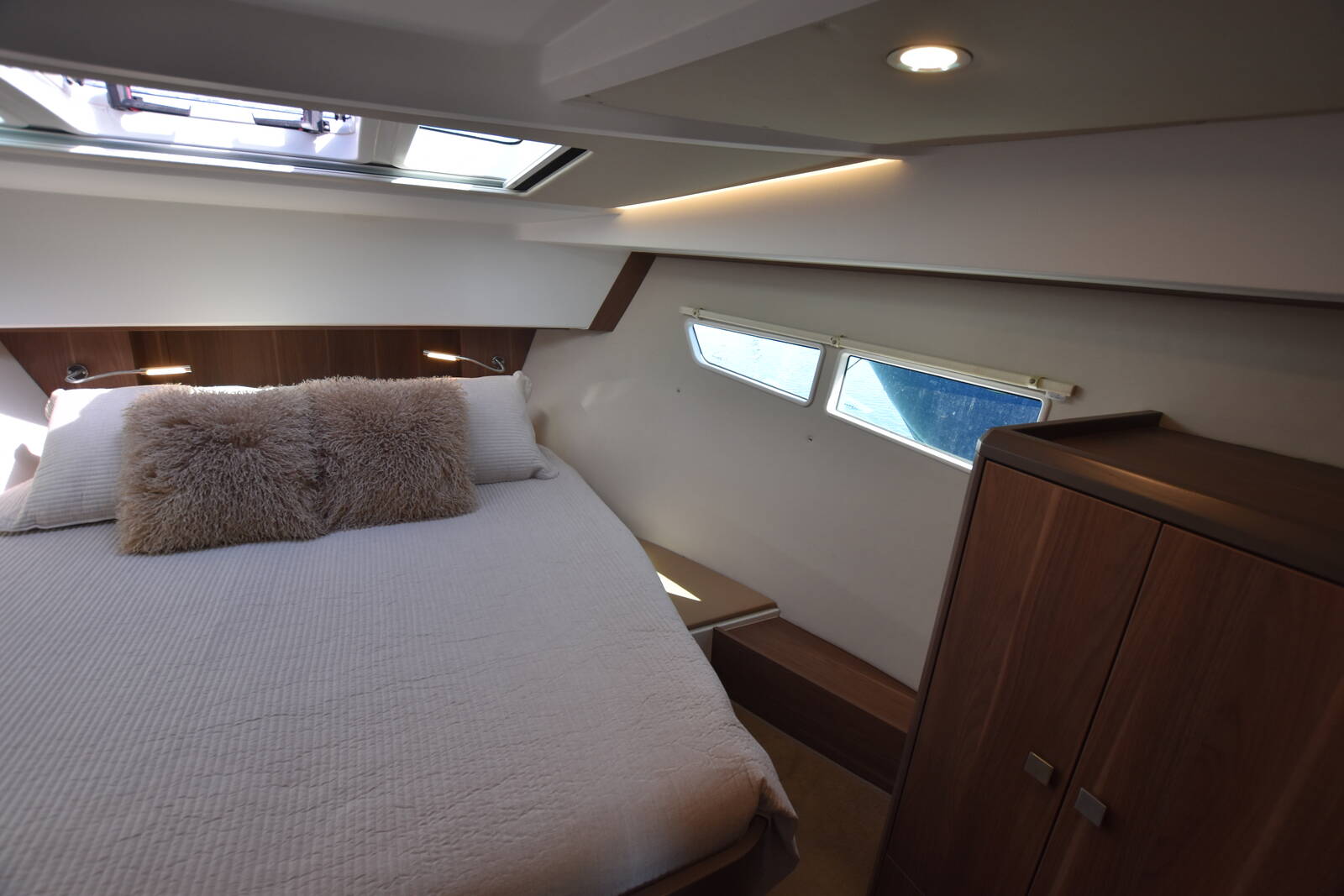 The saloon and galley areas are bright and sociable, enhanced by the electric sunroof and side entry door at the helm, offering excellent ventilation and deck access.