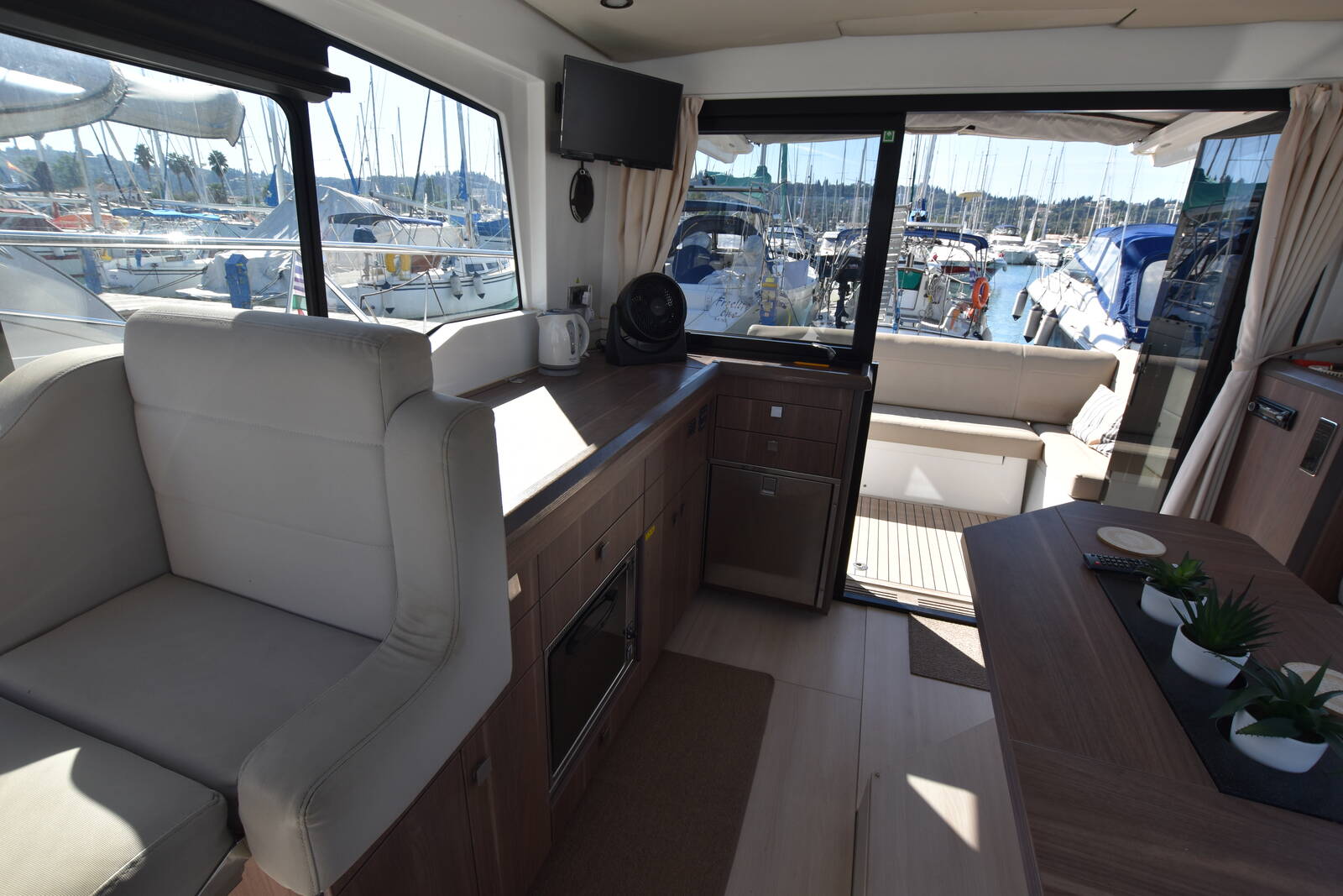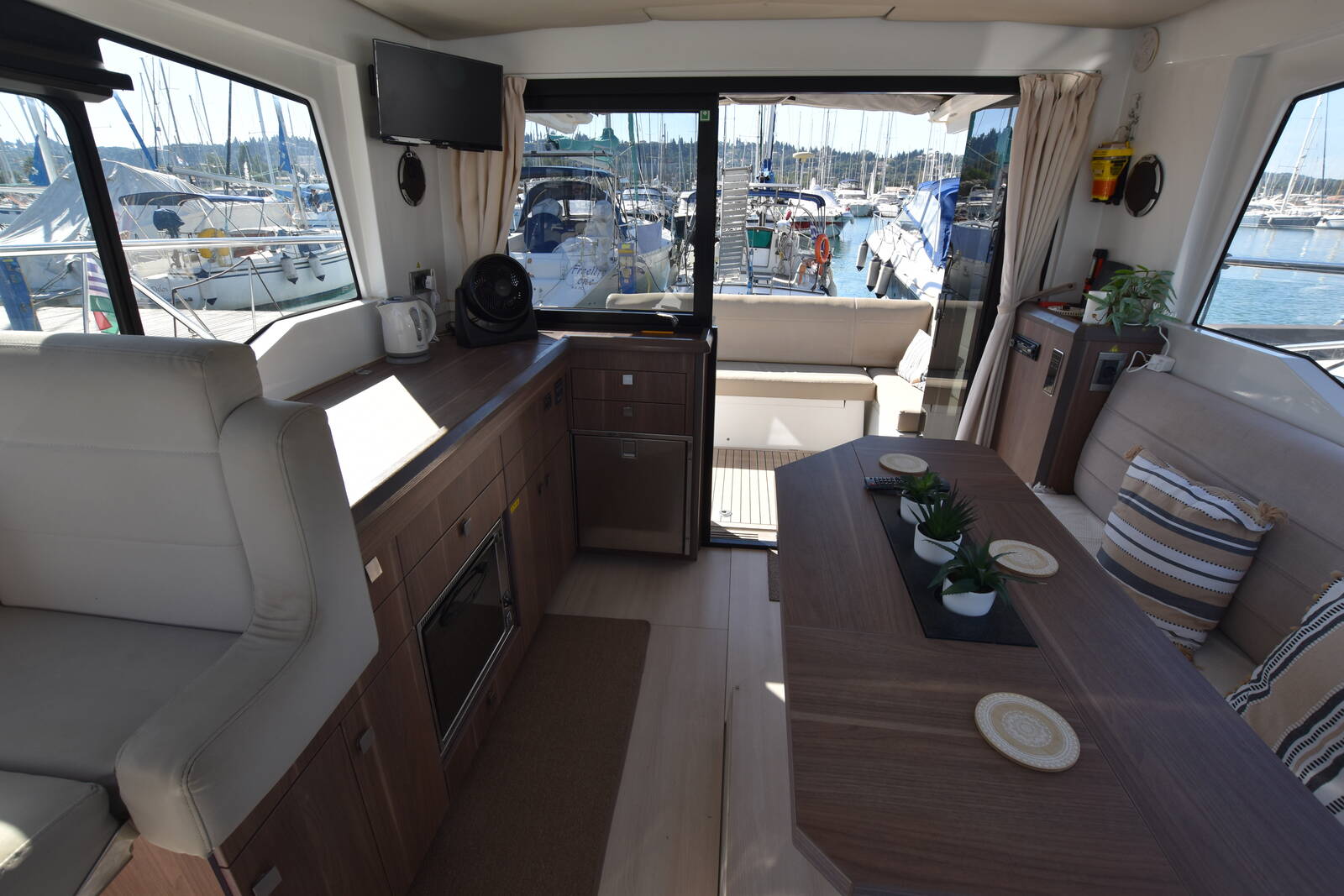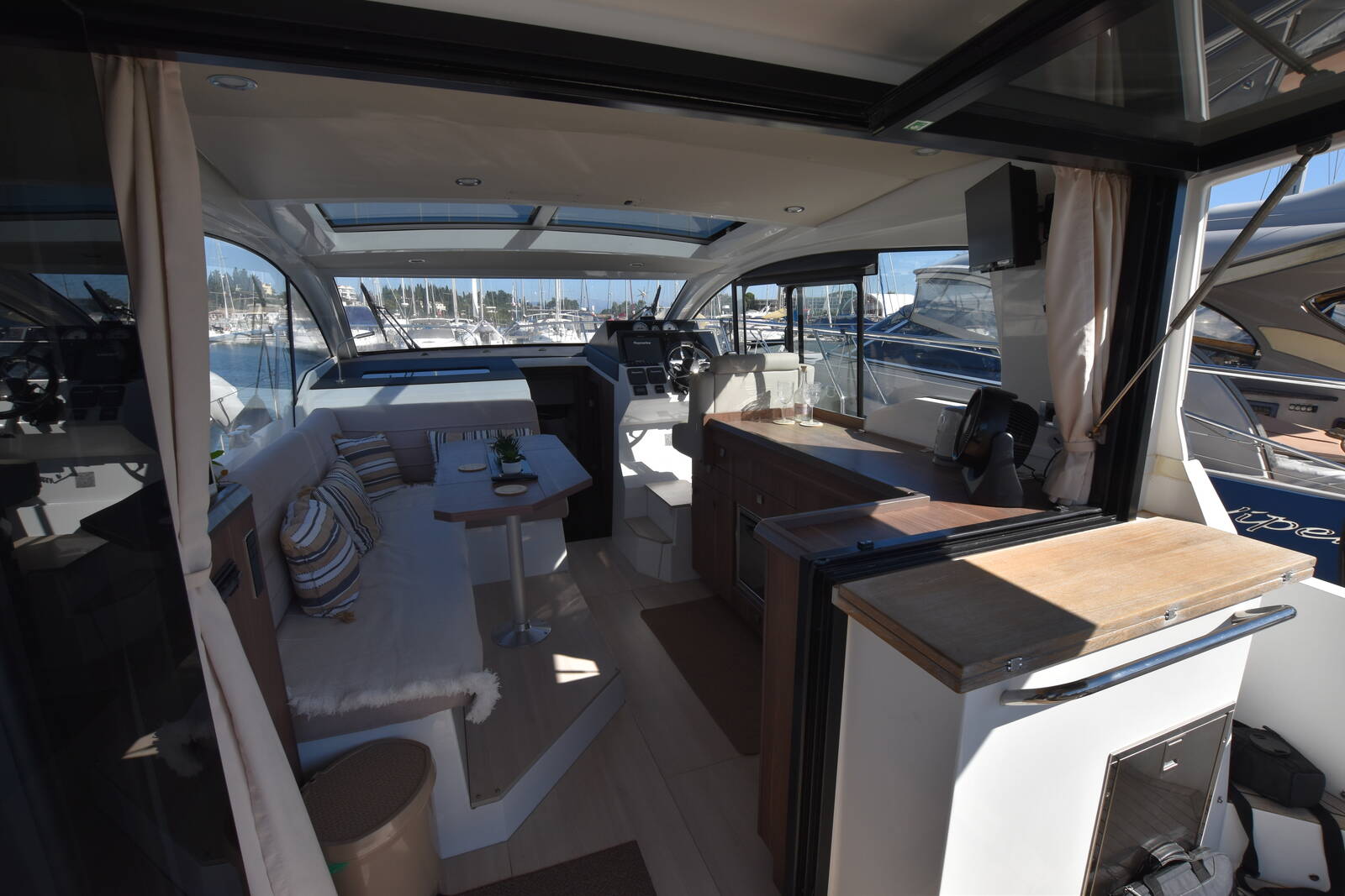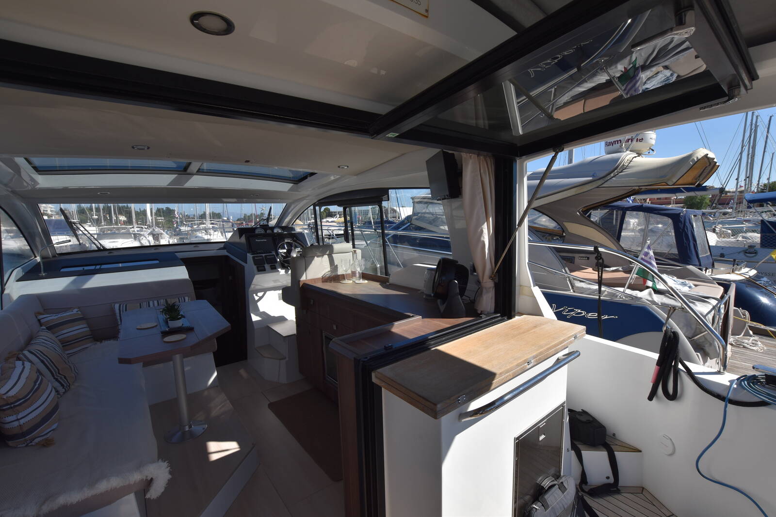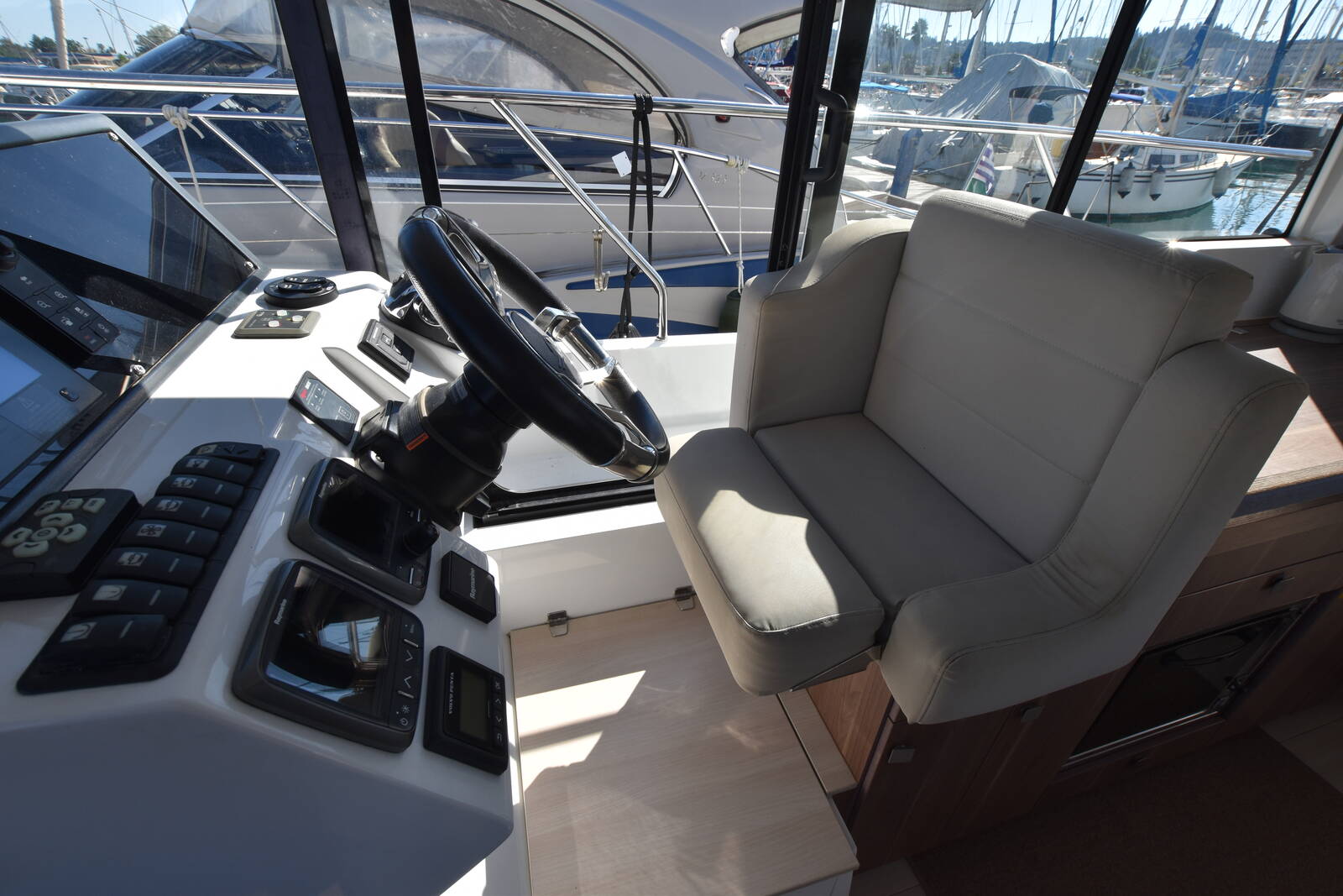 The saloon and galley areas are bright and sociable, enhanced by the electric sunroof and side entry door at the helm, offering excellent ventilation and deck access.