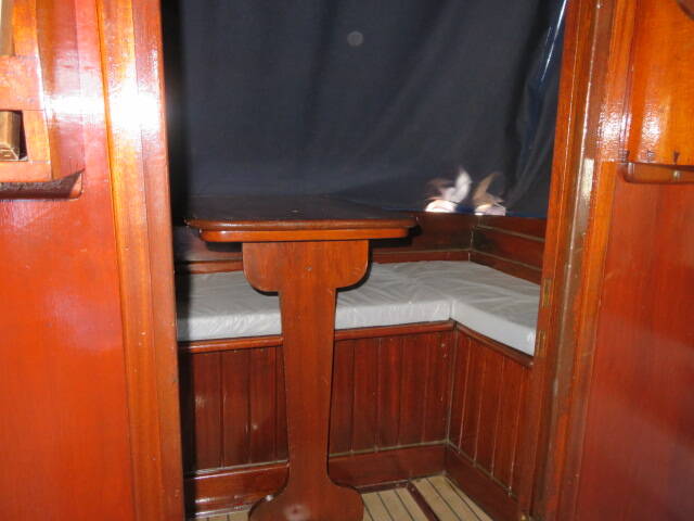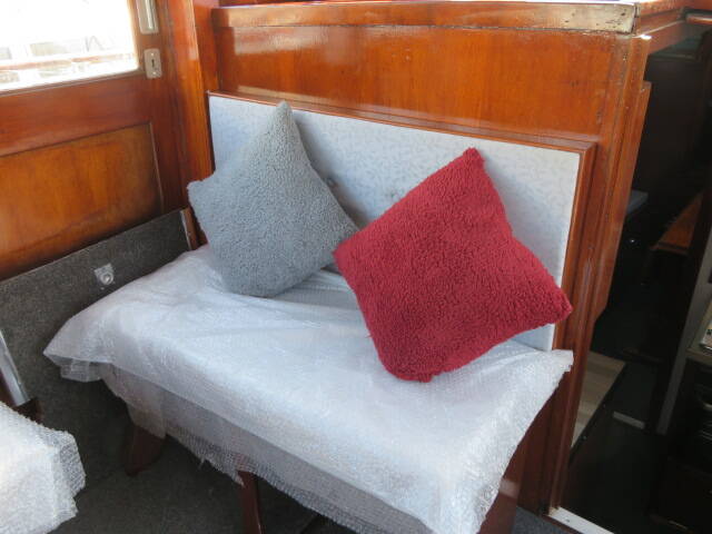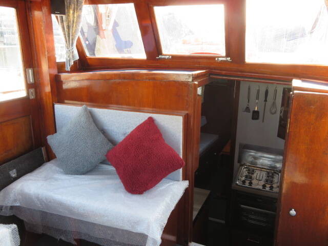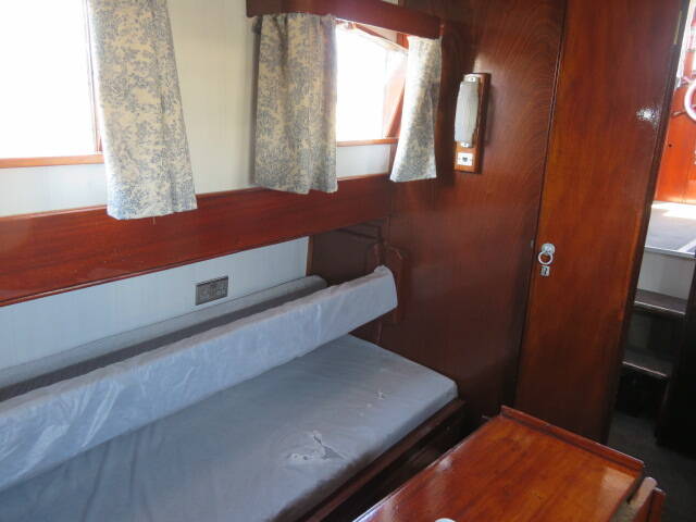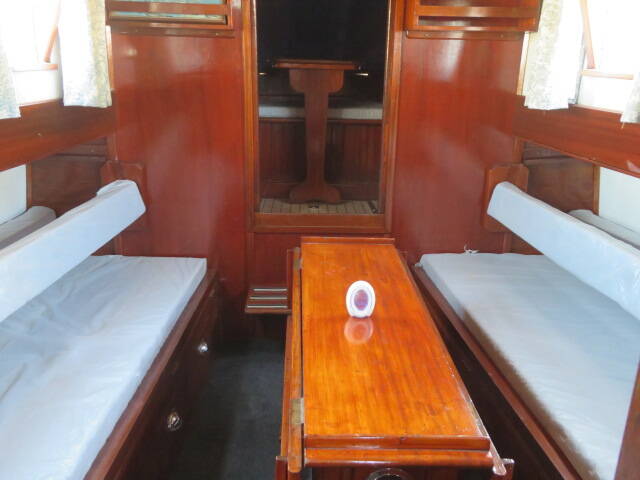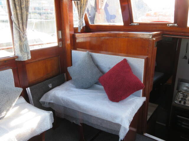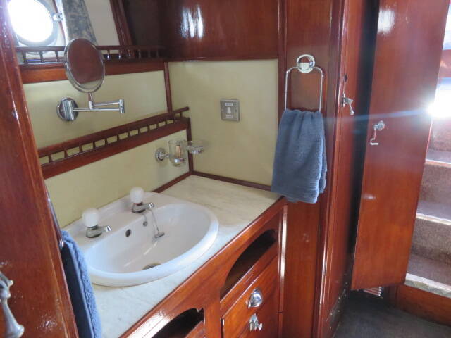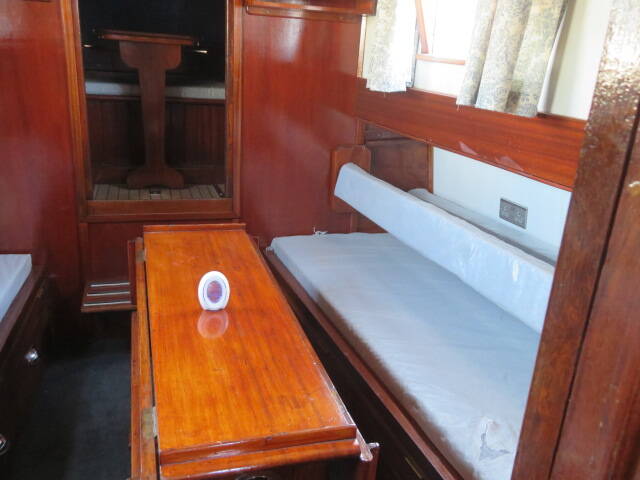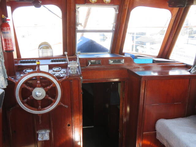 The Wheelhouse offers great visibility through three forward-facing windshields and two large side windows, providing excellent visibility when seated at the Helm. The helm position is located on the port side, with wheel steering and engine controls. The wheelhouse also offers bench seating to starboard and across the stern, leading to the aft galley and cabin. There is also a drinks cabin in the area opposite the helm. The Wheelhouse provides easy access to the two 1960 56hp Parson four-cylinder Diesel engines.