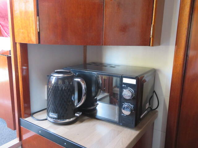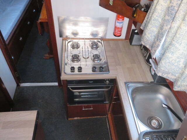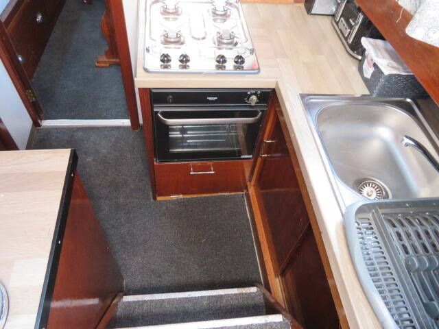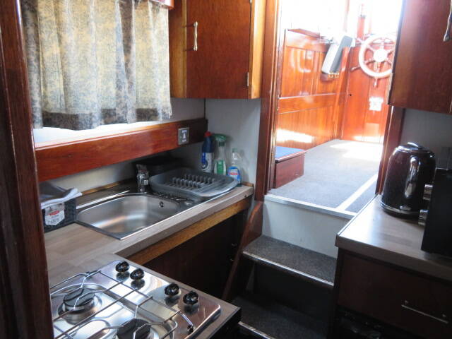 Moving aft via a companion way leads to the galley is located on the port side and is equipped with a 4-burner gas hob with oven and grill, fridge, a microwave, cupboard storage, and two single stainless-steel sinks with pressurised hot and cold water. Hot water is supplied by the engine through a calorifier tank and a 240V immersion heater.