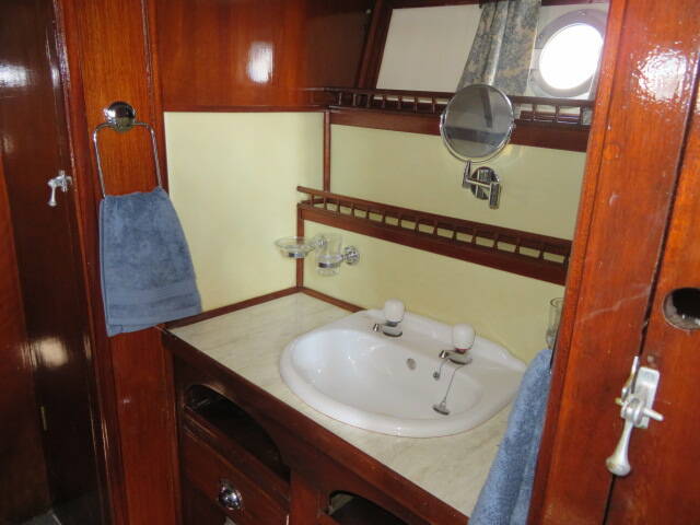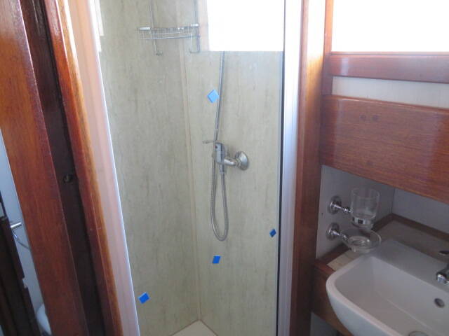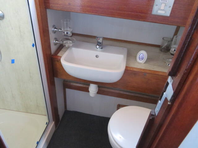 Opposite the galley on the starboard side is the Heads compartment, which includes a sink mounted in a vanity unit with pressurised hot and cold water, a marine toilet, a mirror, a separate shower cubicle and a mixer shower.
