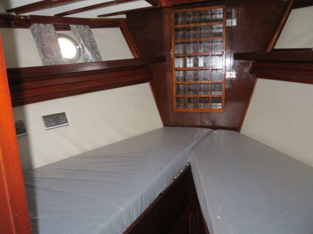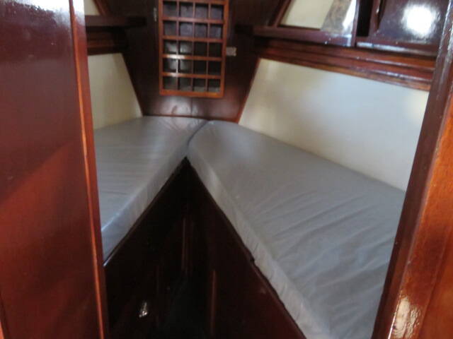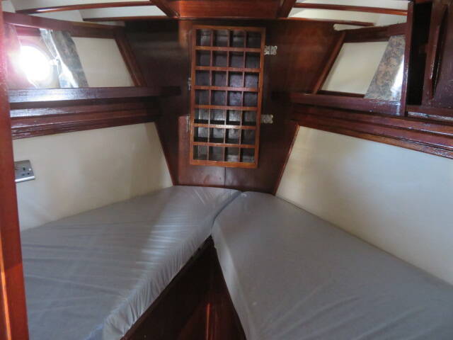 The forward cabin features two single berths, one to both port and starboard. This area also converts into an ensuite for the master cabin located behind, with a marine toilet located under the starboard berth and bath under the berth on the port side with pressurised hot and cold water.
