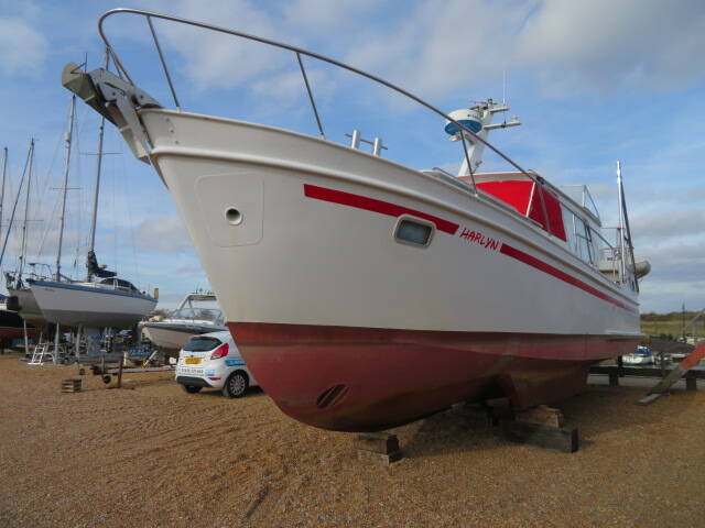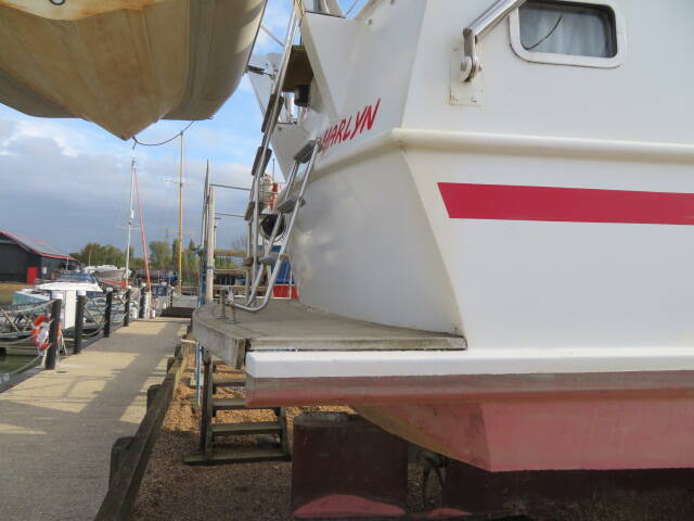 Built in 1992 this Altena 38 has a white steel hull and decks with non-slip surfaces. It has a steel deck in the aft cockpit area. Wheel steering. Steel toe rails. Stainless steel stanchions, pulpit. Glass windscreen with black bonded surround. Walk through the transom gates to the bathing ladder to the bathing platform. Teak battens to the bathing platform. Self-draining cockpit. Currently out of the water, October 2025. Last antifouled and hull polished, and anodes changed in April 2025. The owner is selling as looking for a newer, smaller motor yacht.