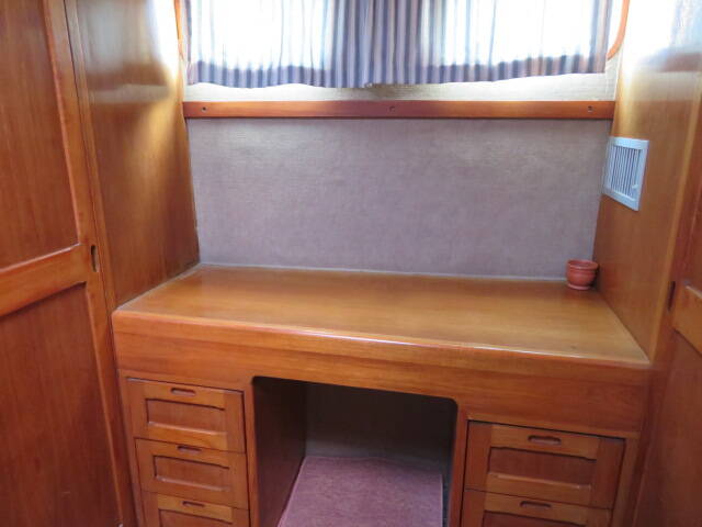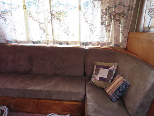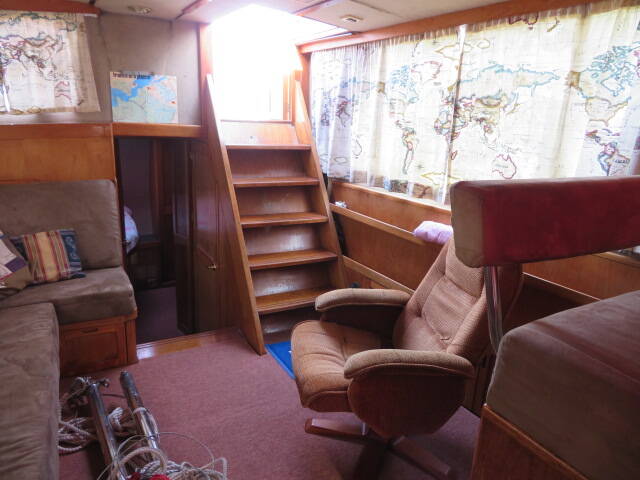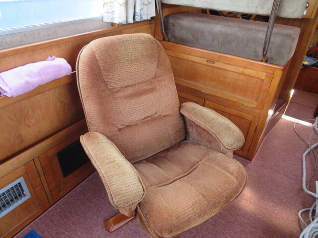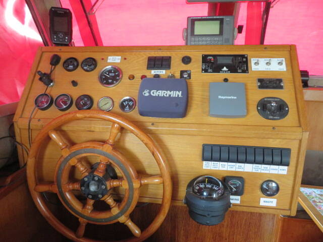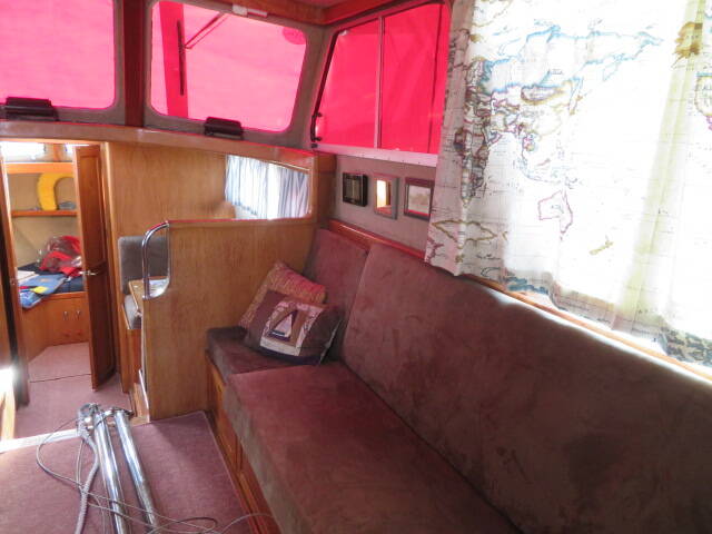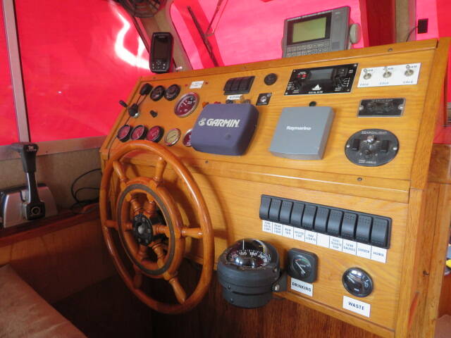 The helm stations, due to their upper and lower positions, give excellent visibility and easy access to the side decks and aft cockpit. This trawler motor yacht has Eberspacher diesel cabin heating, D4. The upholstery is chocolate coloured velour fabric, which gives a warm, cozy feel to the vessel.