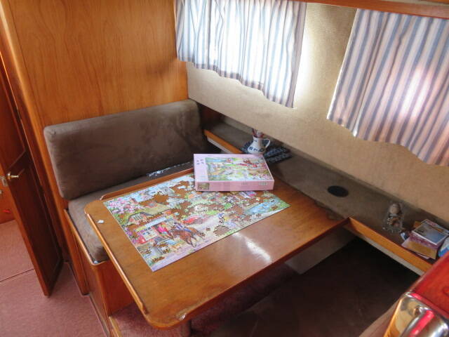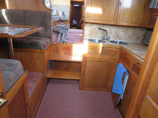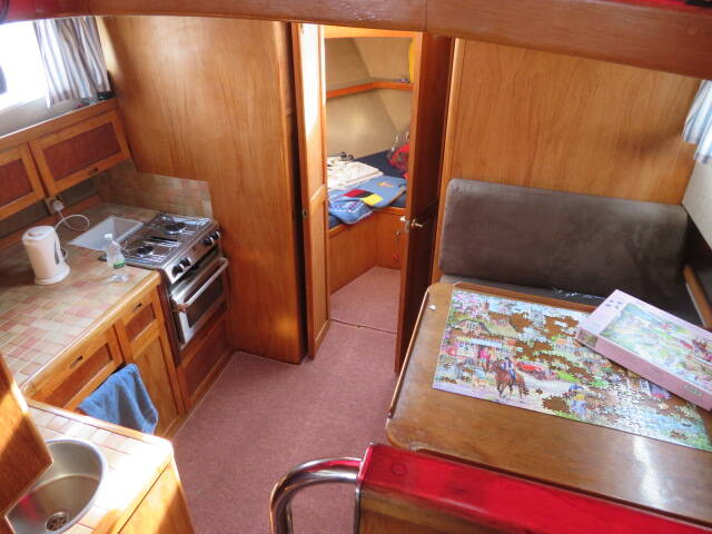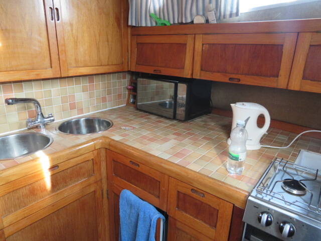 The raised saloon and wheelhouse form a welcoming social area, featuring panoramic views through large windows. You step down into a comfortable dinette with a table that seats four, with the galley opposite. The galley offers all the essentials for onboard living, including a 2-burner gas cooker, an oven with grill that was new in 2024, a double sink with hot and cold water, a refrigerator and freezer, and abundant storage for provisions
