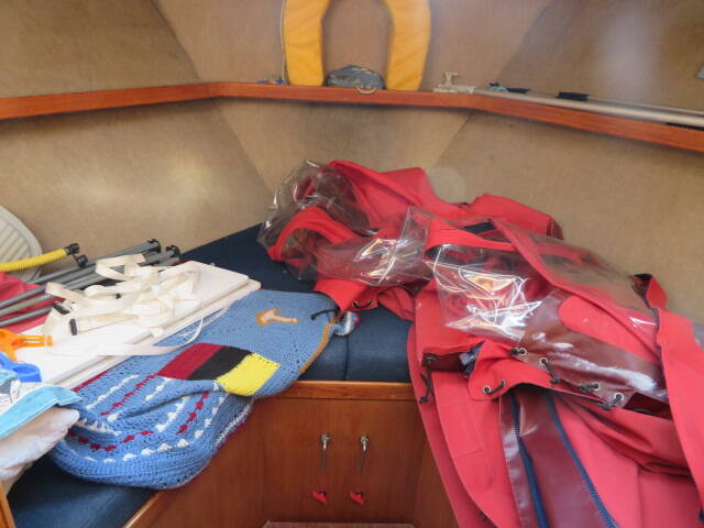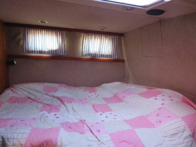 Forward is a bright double cabin with a generous V-berth, plenty of storage, and natural light from an overhead hatch. It has good storage space.