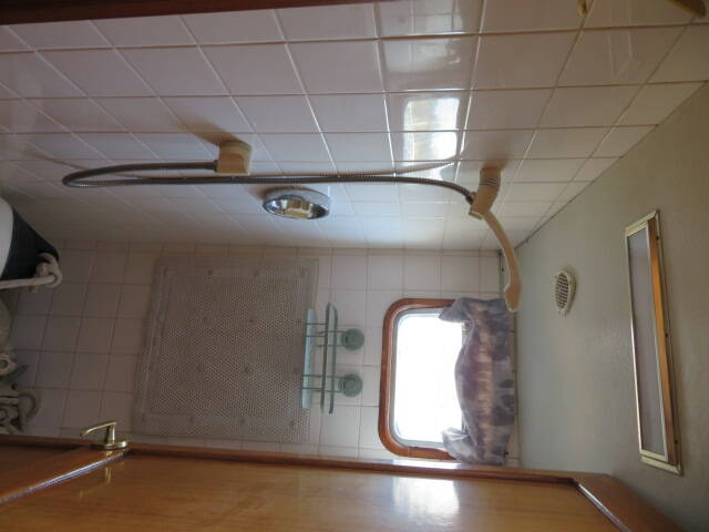 Heads/Shower: Marine toilet with holding tank, washbasin, and shower with pressurised hot and cold water