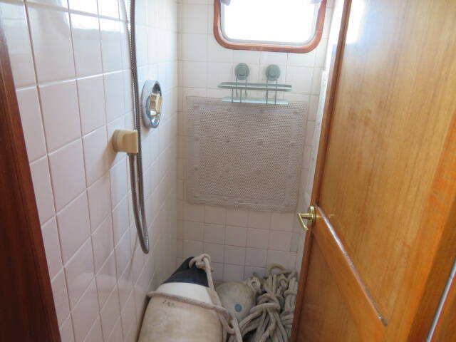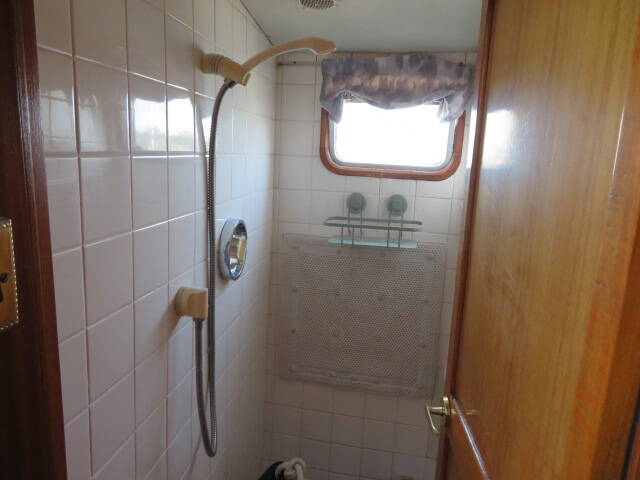 Aft down a couple of steps lies the owner’s cabin, featuring a spacious offset double berth, wardrobes, and additional storage, offering privacy and comfort for longer stays aboard. It also has a separate shower with pressurised hot and cold water and a marine head with sink with hot and cold water, a marine toilet with a holding tank.