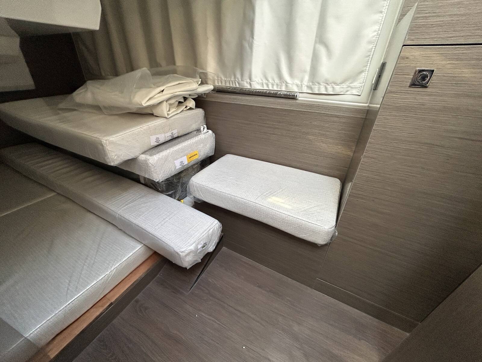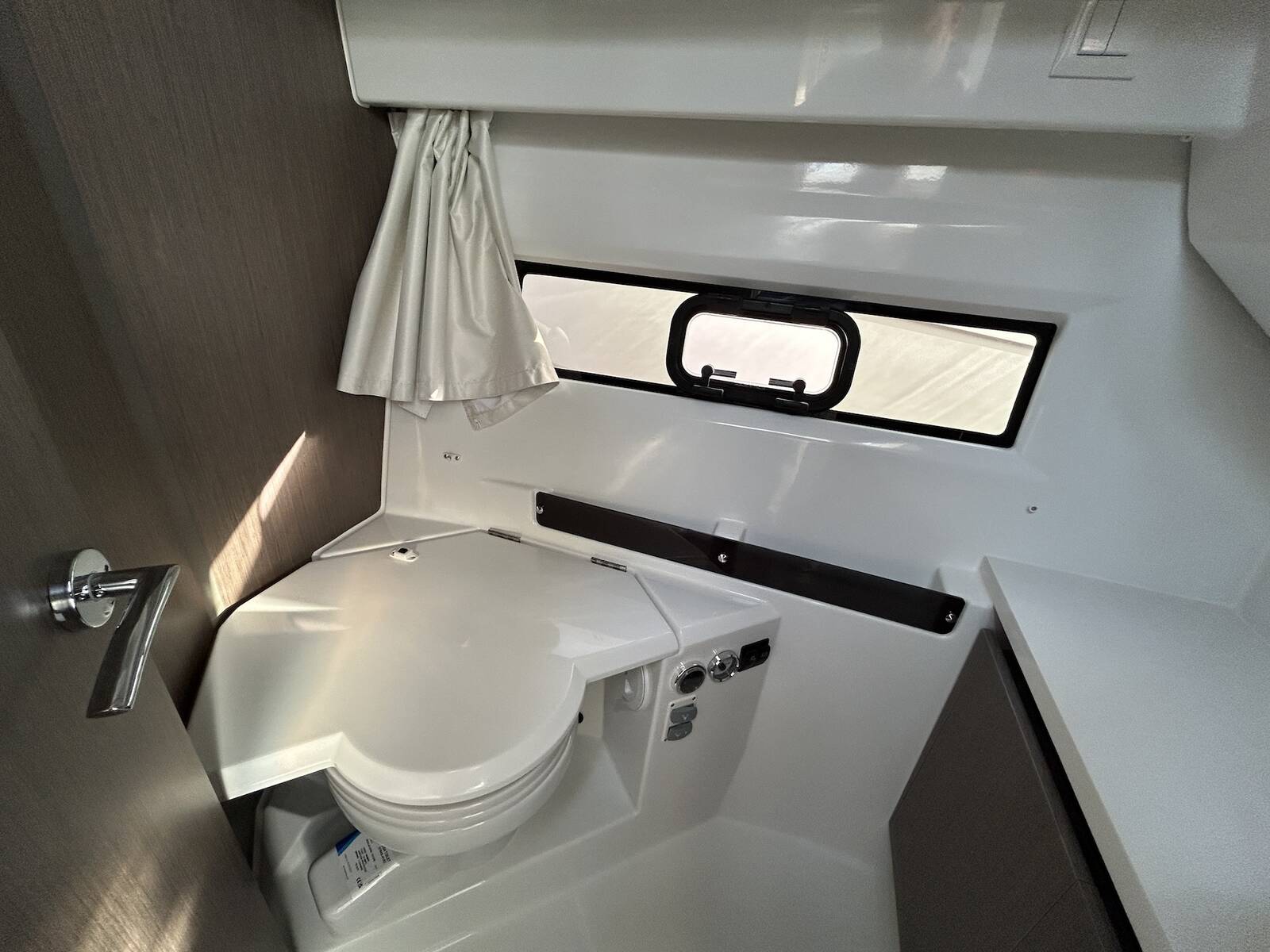 There is a large 2m long island berth double in the master, forward cabin that also has a large storage under the berth. This cabin also has the upgraded storage lockers overhead. This cabin has a large amount of light coming in from the long sea vision inspired potholes and the deck hatch which allows for ventilation. This cabin also has the option extra overhead storage lockers fitted and has a hanging wardrobe on the Portside. This cabin also has ambient, indirect LED lighting as part of the Premier pack.