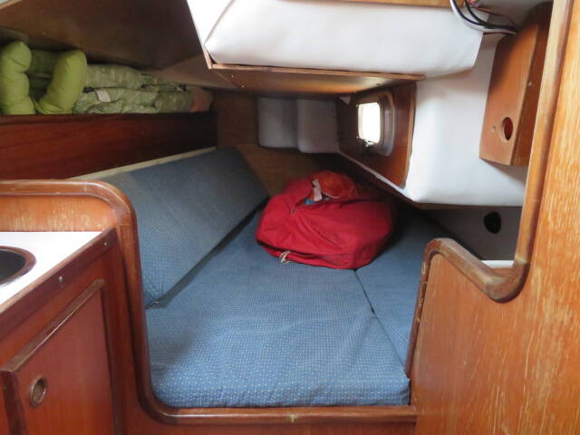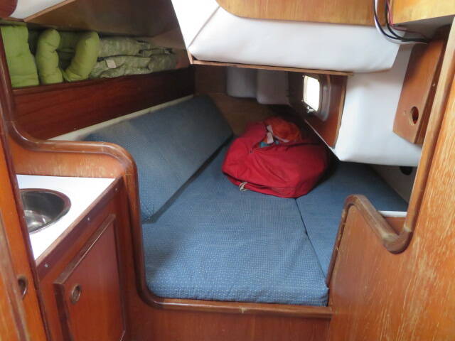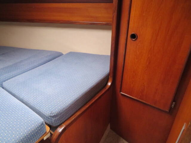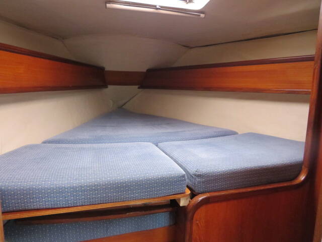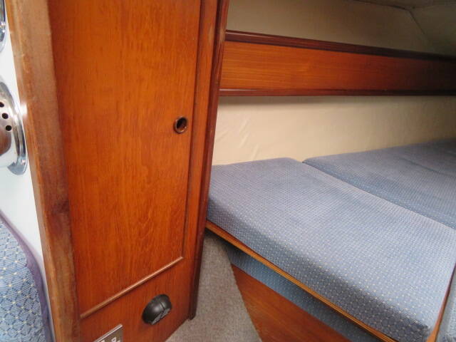 With accommodation for six, she offers two private cabins plus additional berths in the saloon. The forward cabin features a spacious V-berth, ample under-berth and cupboard storage, twin hanging wardrobes, and an overhead deck hatch that fills the cabin with natural light and fresh air.