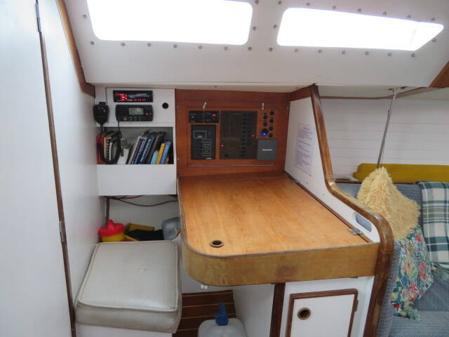 To port, the navigation station features a sizeable chart table, book storage, and instrumentation for safe passage making. Aft of this, the heads compartment offers a vanity unit with sink, a marine toilet with a 60L holding tank, and a hot/cold shower.