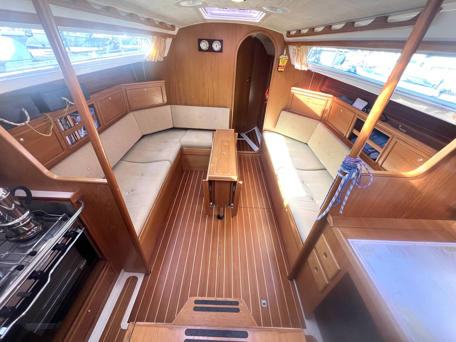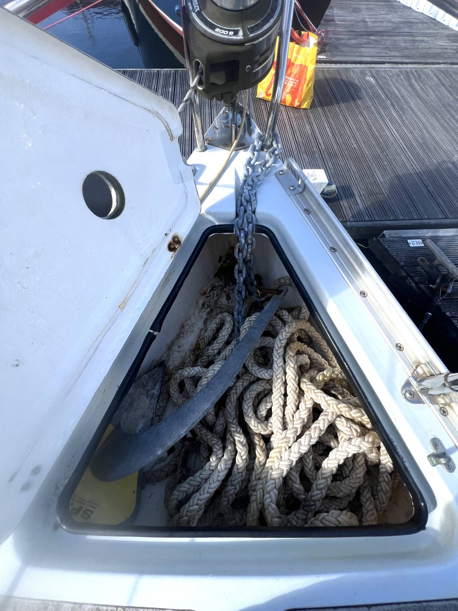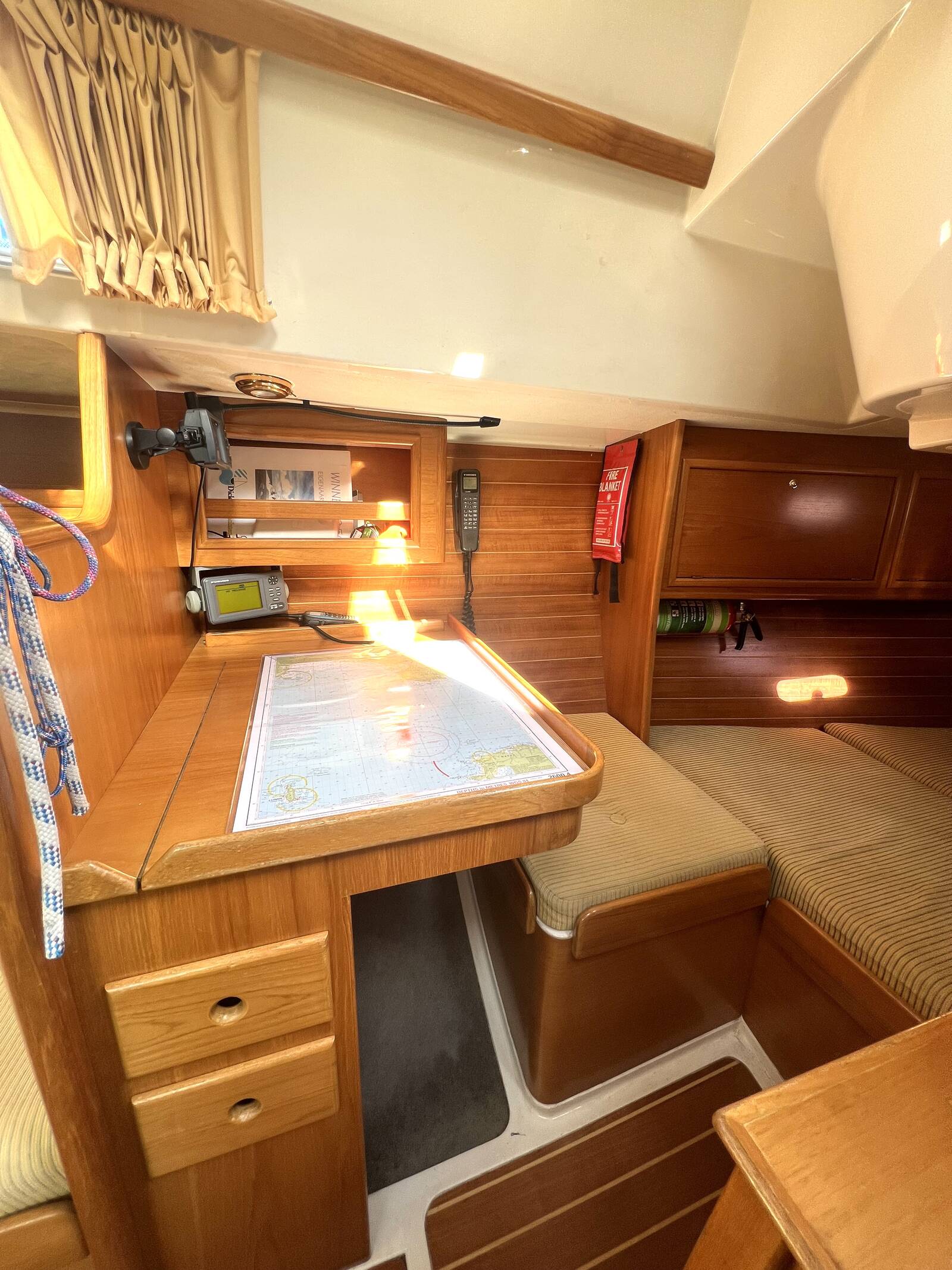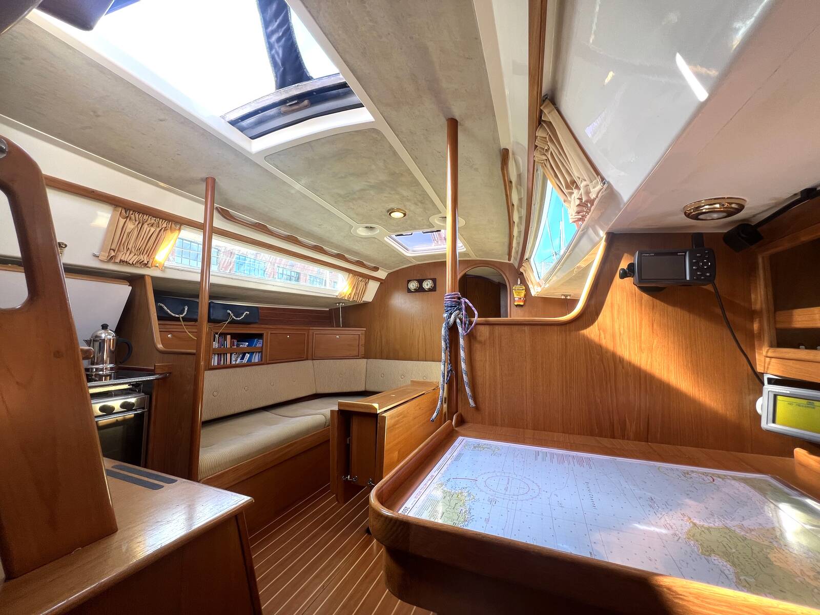 Her dark blue hull gives her a striking profile, complemented by teak-laid cockpit seating, upgraded cushions, cockpit traveller, and quality deck hardware including Lewmar self-tailing winches and midship cleats. Navigation is well-equipped with Raymarine and Raytheon instruments, VHF, and compass. Extras include Zodiac dinghy, spade & bruce anchors, new gas pipes and regulator, and more. A stylish, capable, and upgraded cruiser ready for her next adventure.