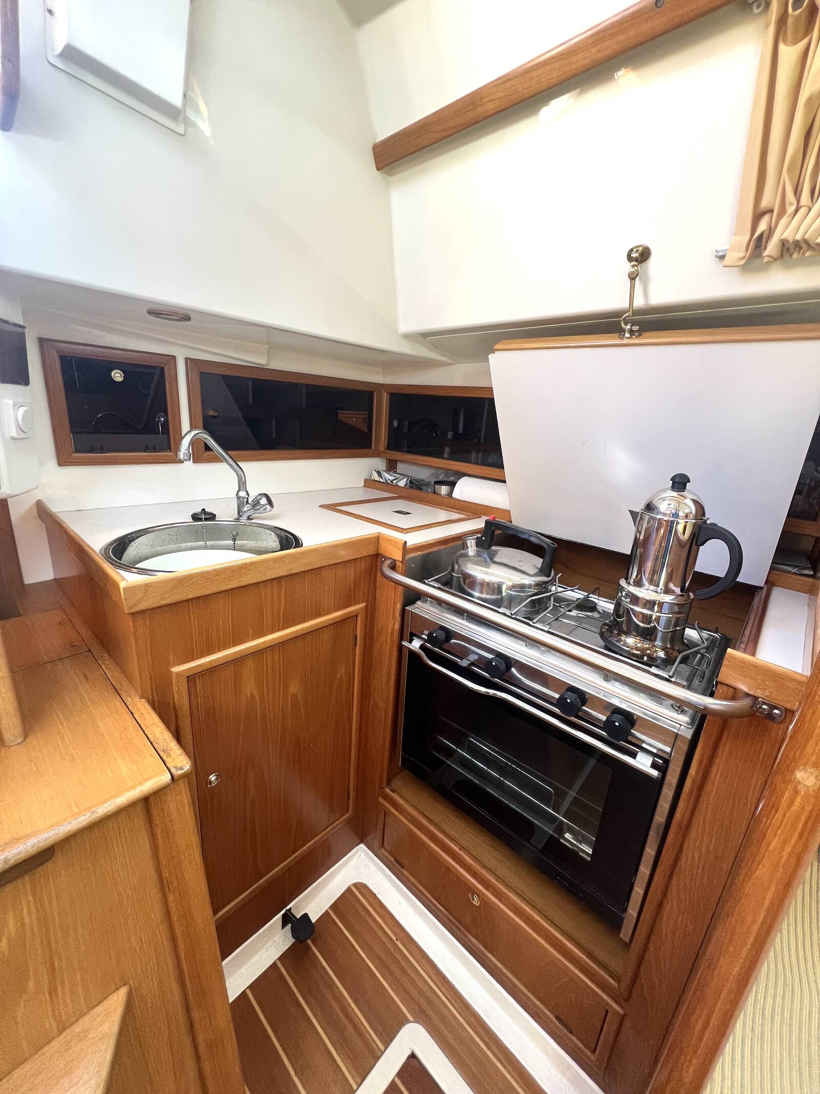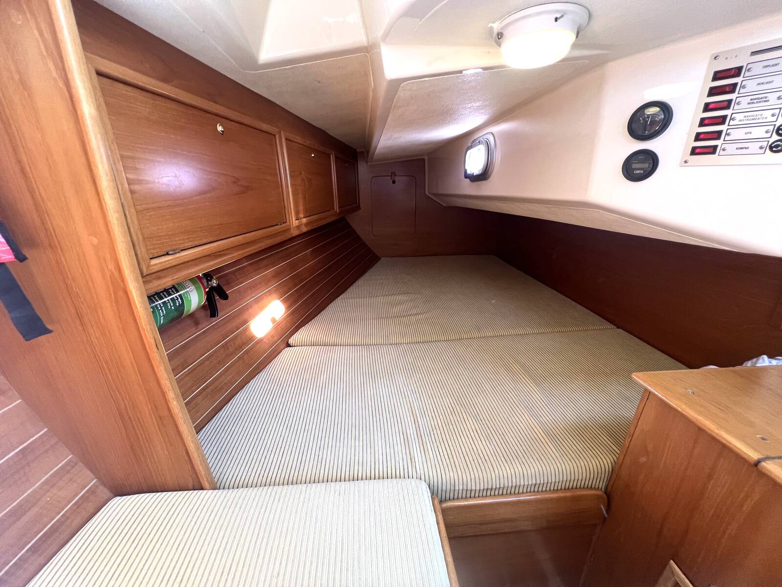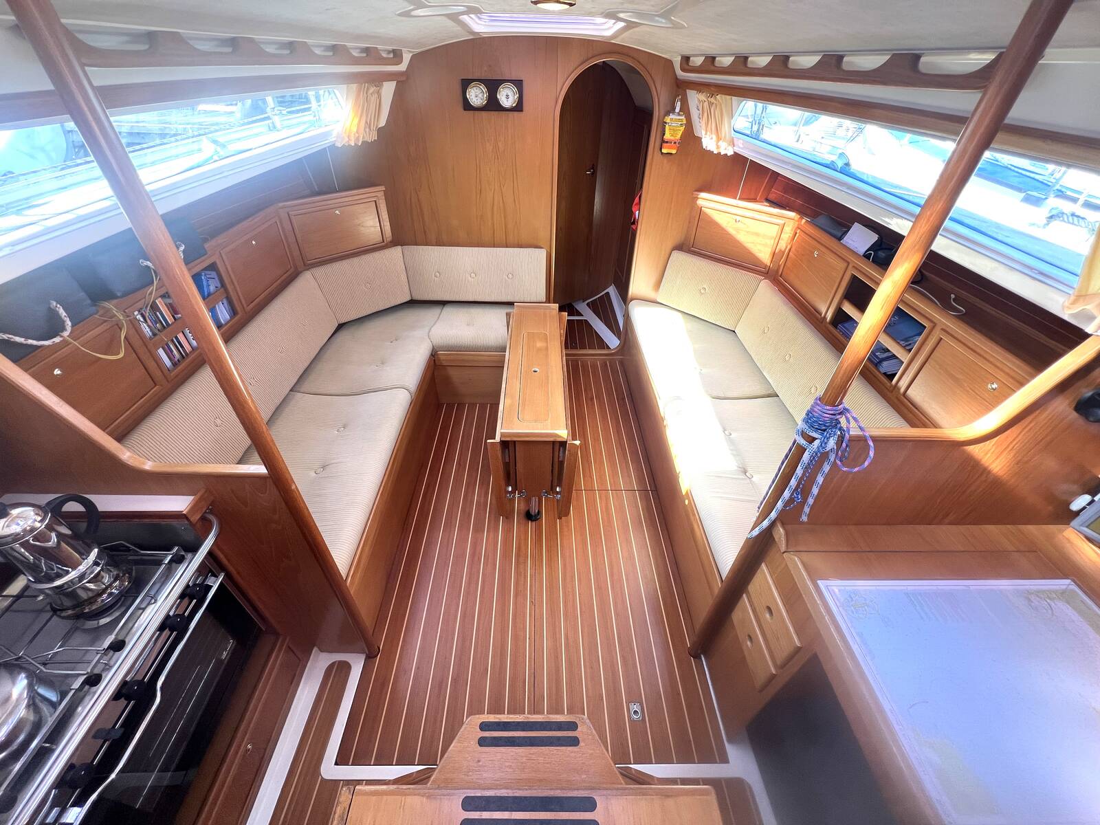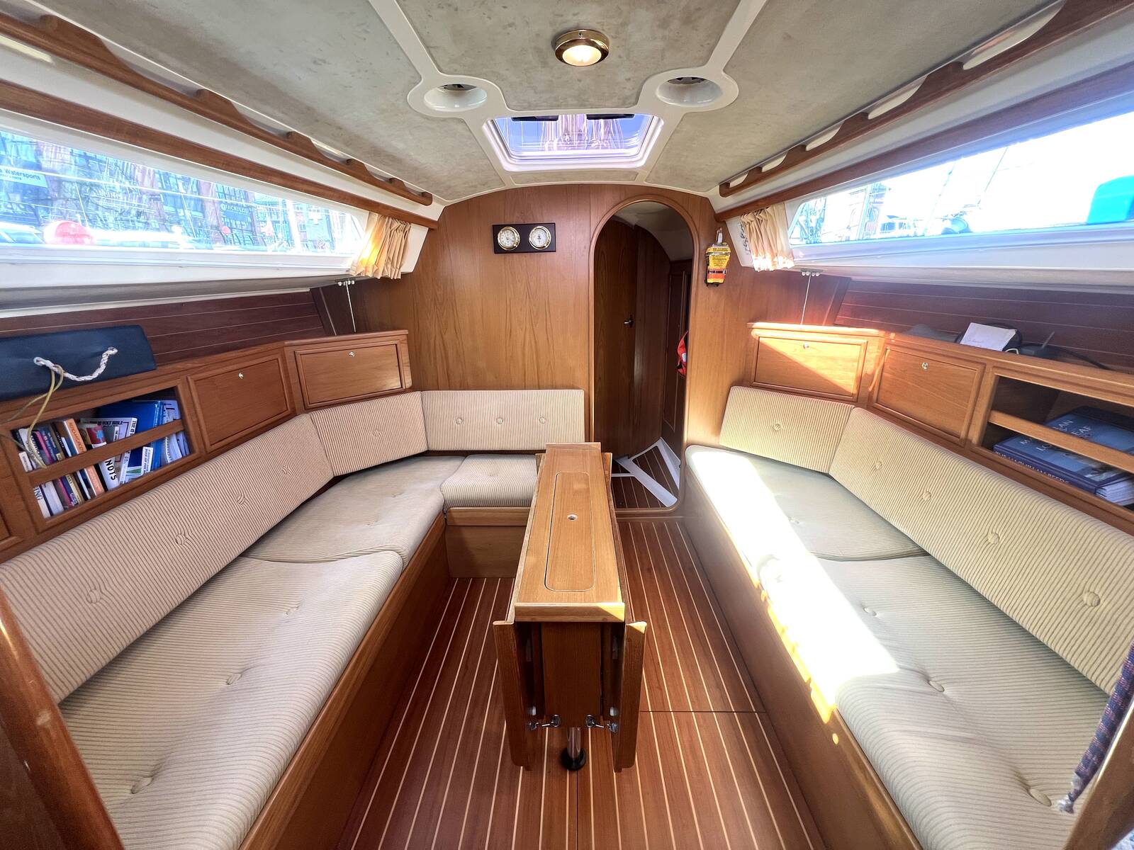 Her dark blue hull gives her a striking profile, complemented by teak-laid cockpit seating, upgraded cushions, cockpit traveller, and quality deck hardware including Lewmar self-tailing winches and midship cleats. Navigation is well-equipped with Raymarine and Raytheon instruments, VHF, and compass. Extras include Zodiac dinghy, spade & bruce anchors, new gas pipes and regulator, and more. A stylish, capable, and upgraded cruiser ready for her next adventure.
