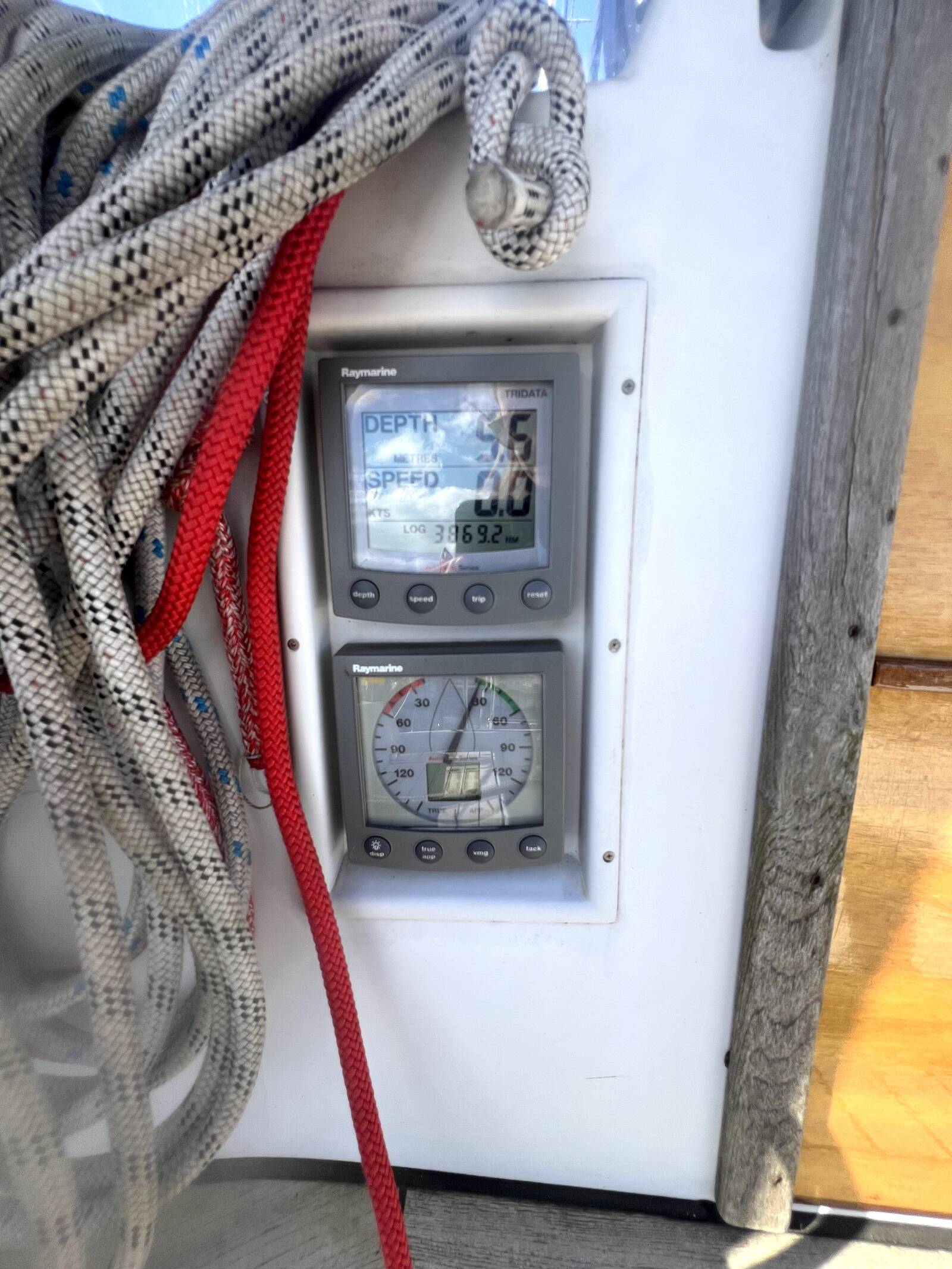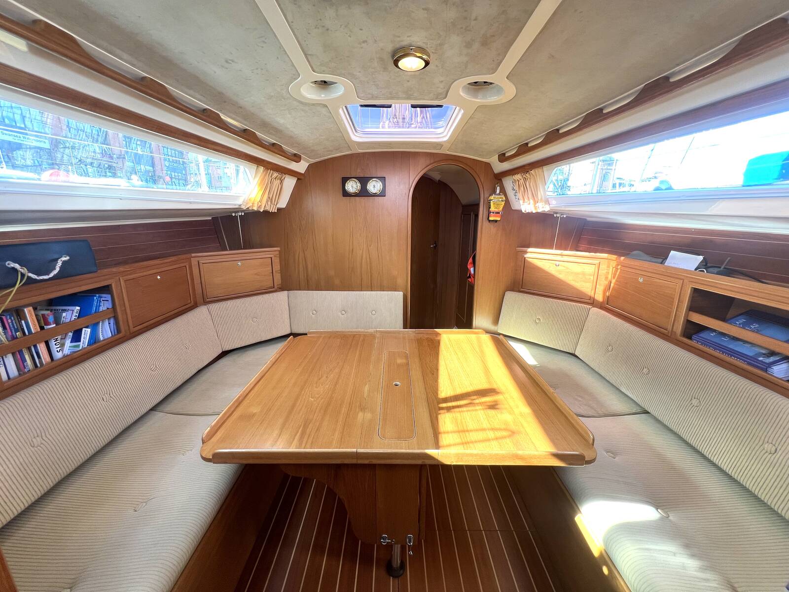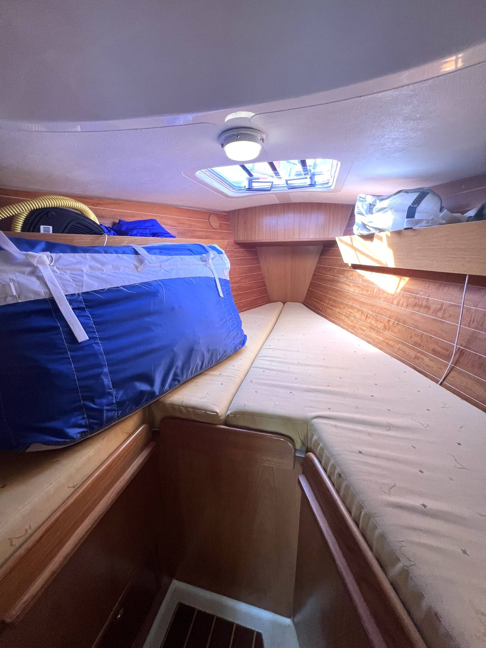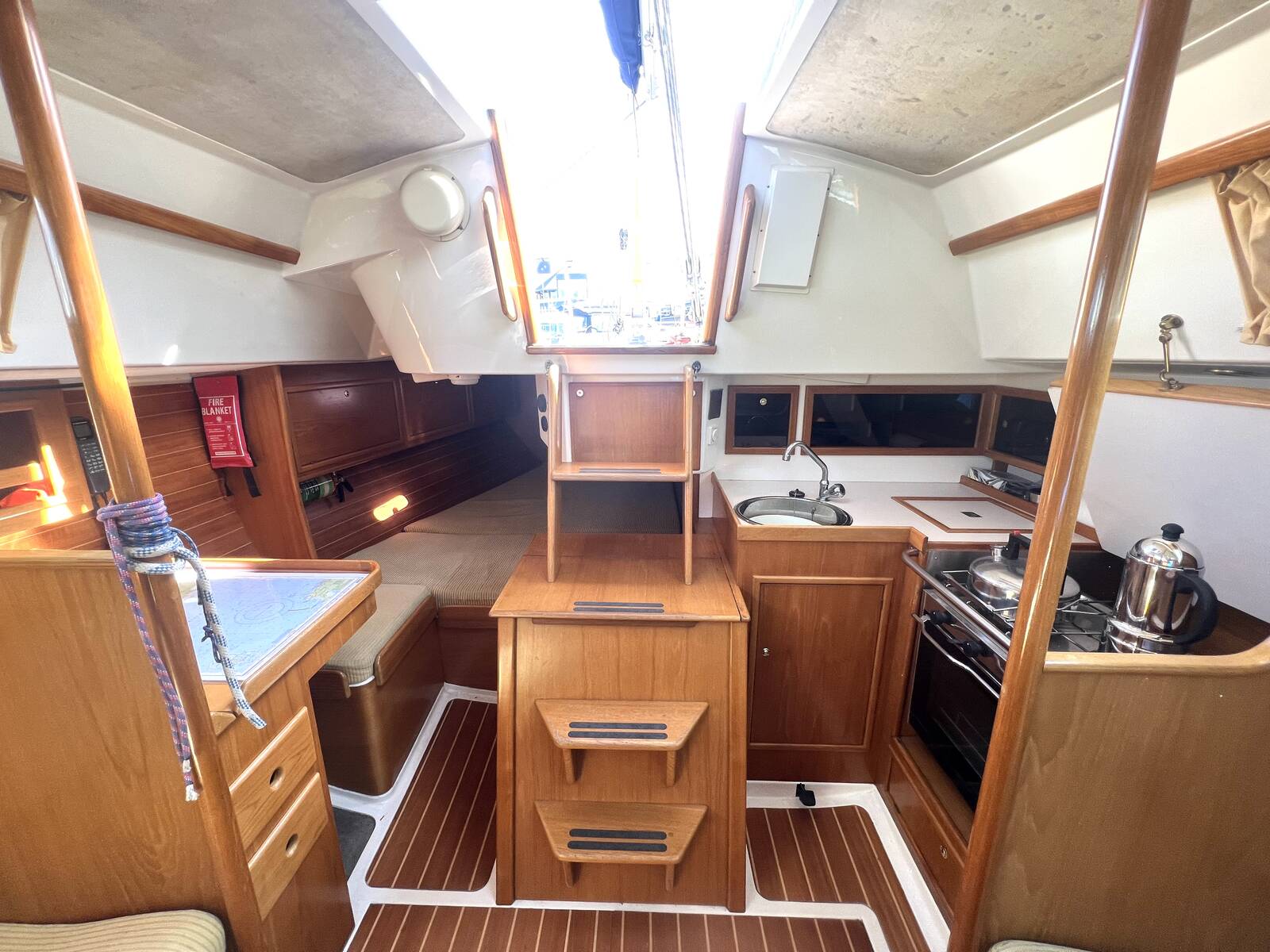 Her dark blue hull gives her a striking profile, complemented by teak-laid cockpit seating, upgraded cushions, cockpit traveller, and quality deck hardware including Lewmar self-tailing winches and midship cleats. Navigation is well-equipped with Raymarine and Raytheon instruments, VHF, and compass. Extras include Zodiac dinghy, spade & bruce anchors, new gas pipes and regulator, and more. A stylish, capable, and upgraded cruiser ready for her next adventure.